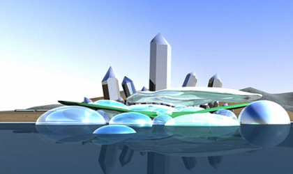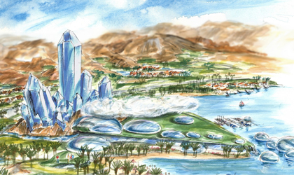 Beschreibung: Direkt am Westufer des Sees Lake Measd in Las Vegas wurde ein 5 Sterne Hotelkomplex in Kristallform entworfen, der neben 4000 Zimmern 500 Suiten beinhalten soll, welche beliebig erweiterbar sind. Infrastrukturell soll in dem Gebäude von Wellness und Fitness Bereichen über Konferenzsäle, Restaurants bis zum Shopping Center alles enthalten sein. Die Zufahrt zu den Gebäuden, sowie die Unterbringung der Autos, soll unterirdisch unter dem Hotelkonglomerat erfolgen.